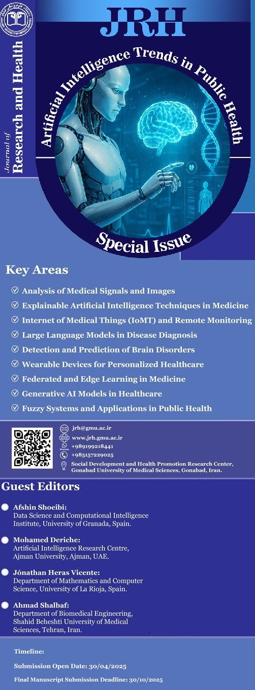 ژورنال Research and Health در نظر دارد به منظور گسترش مباحث علمی و پژوهشی در حوزه هوش مصنوعی، ویژه نامه ای تحت عنوان " Artificial Intelligence Trends in Public Health " منتشر نماید.