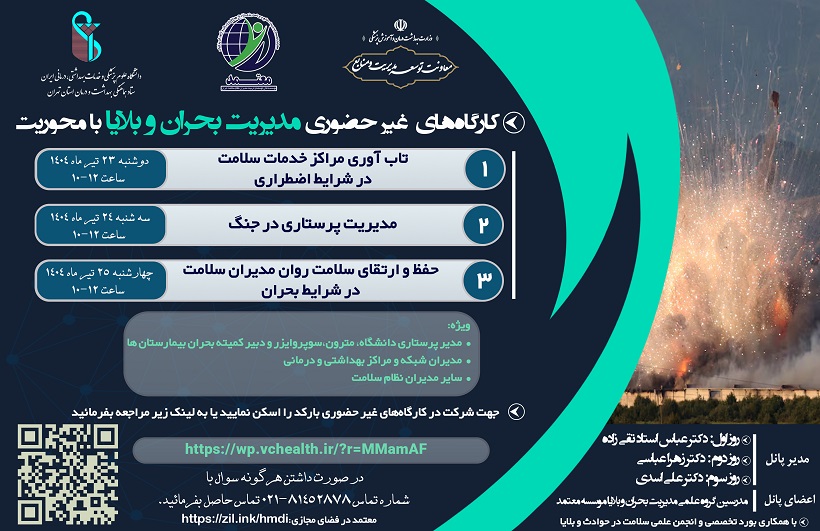 کلیدواژه‌ها: کارگاه بحران سلامت غیر حضوری کارگاه غیرحضوری مدیریت بحران و بلایا بلایا مدیریت بحران مدیریت بلایا