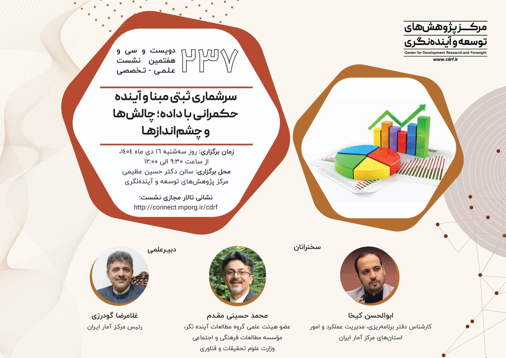 نشست علمی سرشماری ثبتی مبنا آینده حکمرانی با داده ۱۴ دی ۱۴۰۴ | ۱۰:۲۱ کد : ۵۷۴۱۸ اطلاعیه ارسال به دیگران نام شما ایمیل شما ایمیل دریافتکننده ارسال انصراف تعداد بازدید:۷۱۵ دویست وسی وهفتمین نشست علمی - تخصصی با عنوان سرشماری ثبتی مبنا آینده حکمرانی با داده، چالش ها وچشم اندازها