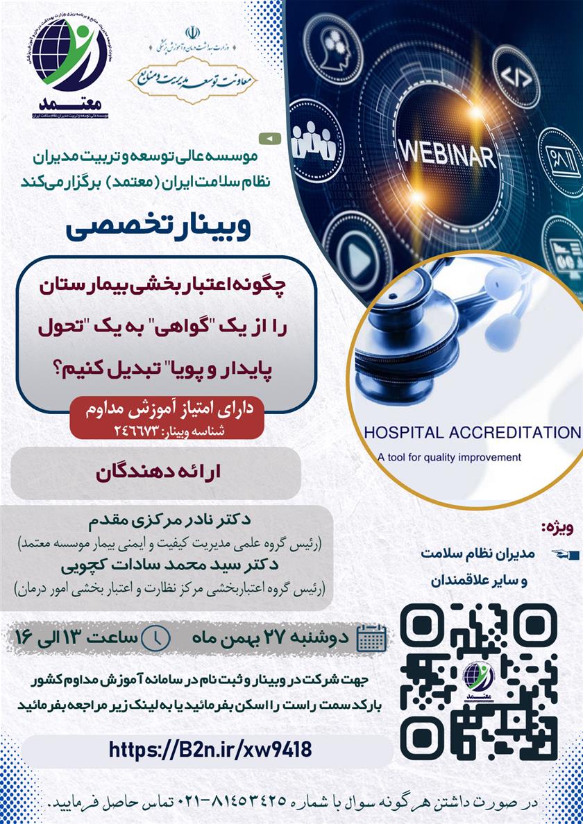 وبینار تخصصی "چگونه اعتباربخشی بیمارستان را از یک "گواهی" به یک "تحول پایدار و پویا" تبدیل کنیم؟ ۲۶ بهمن ۱۴۰۴ | ۱۲:۱۴ کد : ۵۸۰۱۱ اطلاعیه ارسال به دیگران نام شما ایمیل شما ایمیل دریافتکننده ارسال انصراف تعداد بازدید:۲۳۸ برگزاری وبینار تخصصی "چگونه اعتباربخشی بیمارستان را از یک " گواهی" به یک " تحول پایدار و پویا " تبدیل کنیم؟